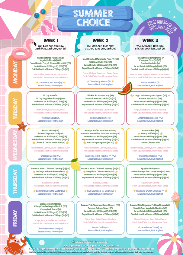 Highlees Primary School has its own kitchens and provides a choice of main meals, at least one of which is vegetarian and a selection of salads and fresh vegetables. The choice of dessert includes a hot pudding, fresh fruit and a variety of cold desserts. Please advise the School Office of any specific dietary needs or allergies.